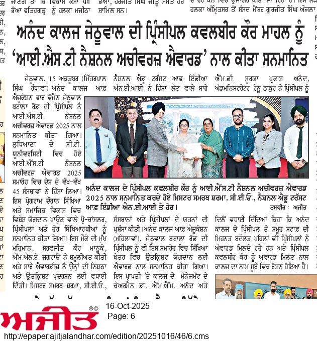 ਅਨੰਦ ਕਾਲਜ ਜੇਠੂਵਾਲ ਦੀ ਪ੍ਰਿੰਸੀਪਲ ਕਵਲਬੀਰ ਕੌਰ ਮਾਹਲ ਨੂੰ ‘ਆਈ.ਐਸ.ਟੀ ਨੈਸ਼ਨਲ ਅਚੀਵਰਜ਼ ਐਵਾਰਡ’ ਨਾਲ ਕੀਤਾ ਸਨਮਾਨਿਤ |